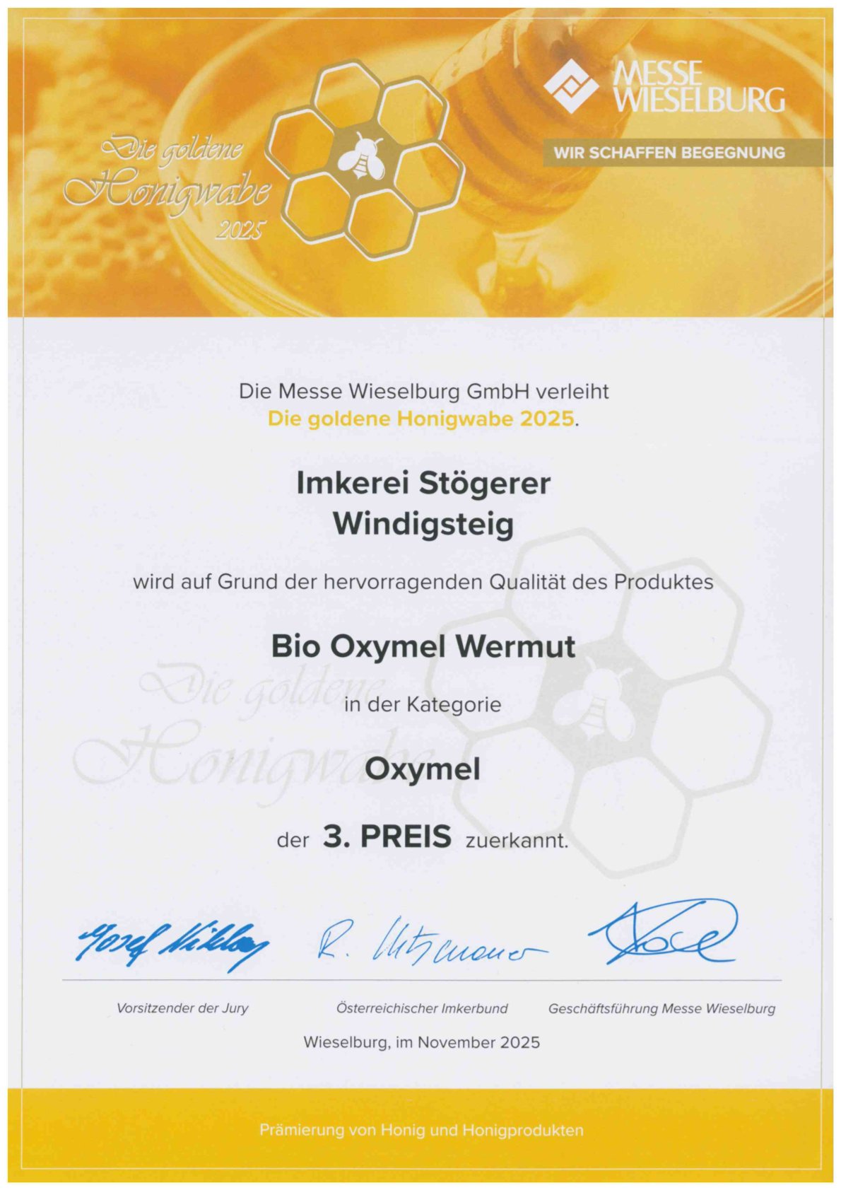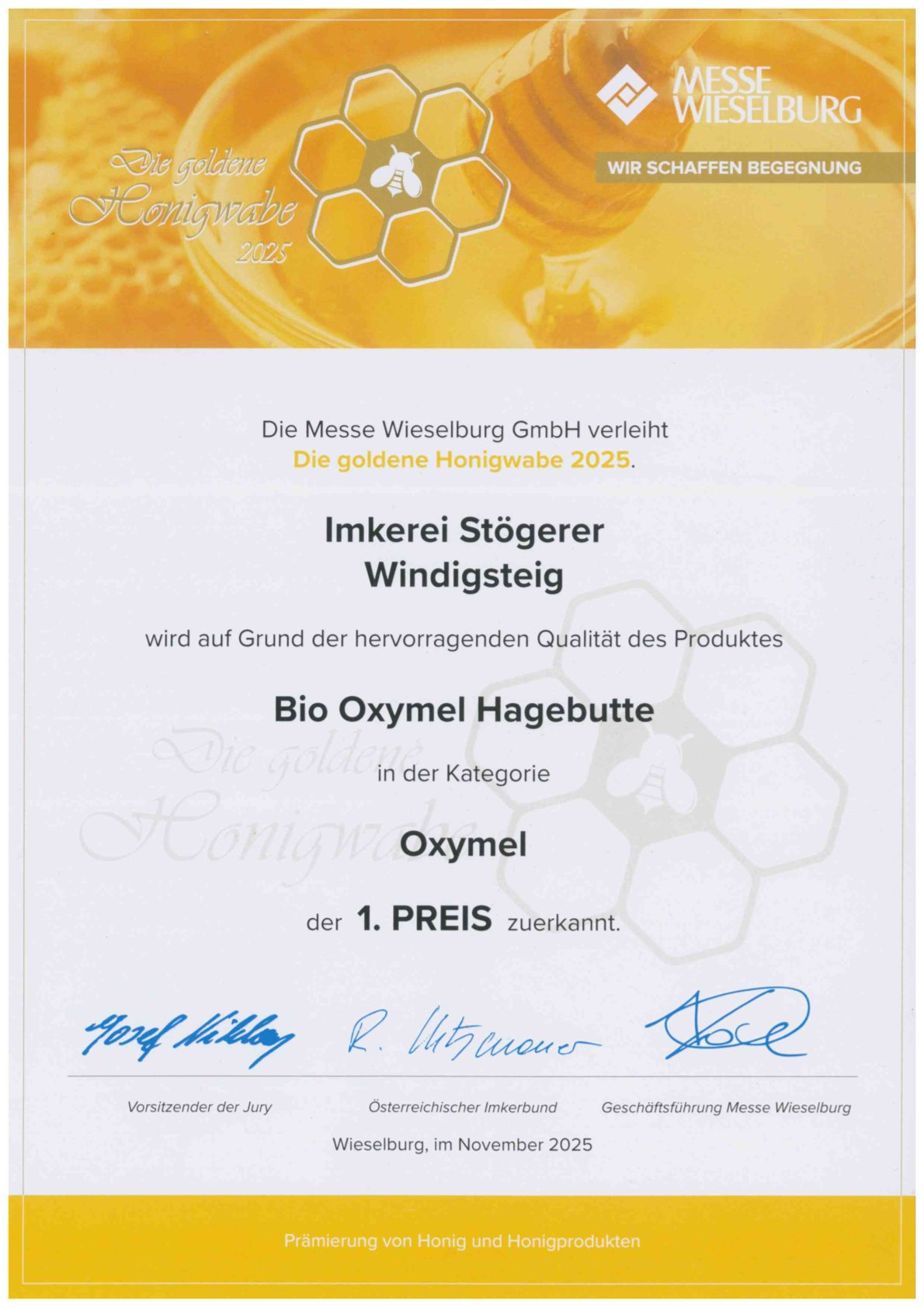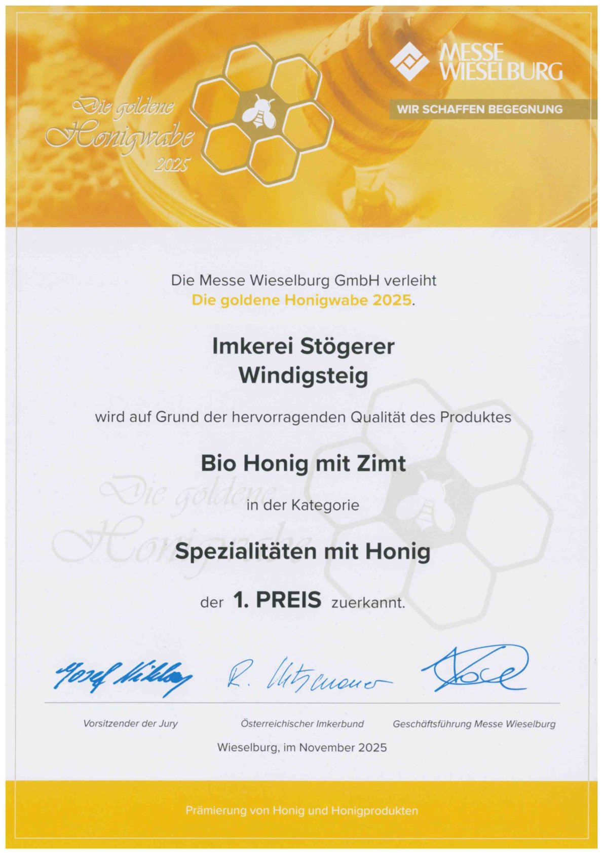 Diese spezielle Auszeichnung erhalten Imkereibetriebe die den strengen Kriterien des Honig-Gütesiegel mit ihren Produkten entsprechen. Durch eine Betriebskontrolle des NÖ Imkerverbands vor Ort wird kontrolliert ob der Betrieb allen Anforderungen, Gebäudetechnisch vom Honiglager über den Schleuderraum und den Verarbeitungsräumen, sowie im Bereich der Lebensmittelhygiene und Bienenhaltung, in vorbildlicher Weise allen Bestimmungen entspricht.