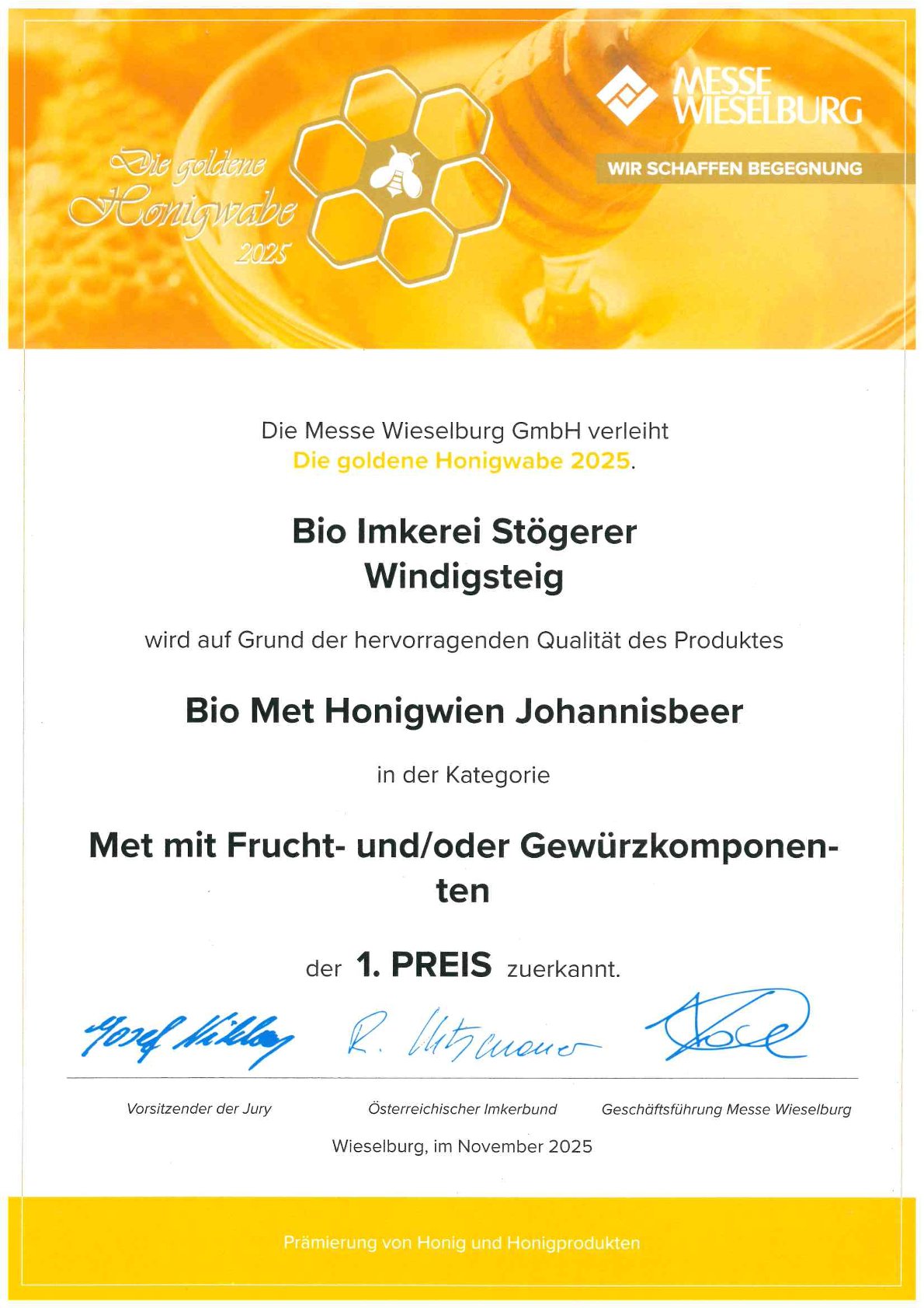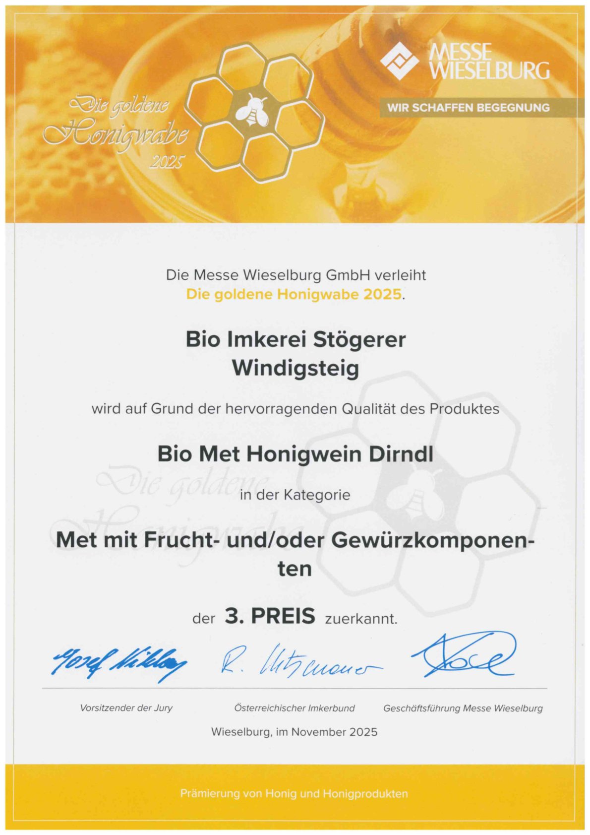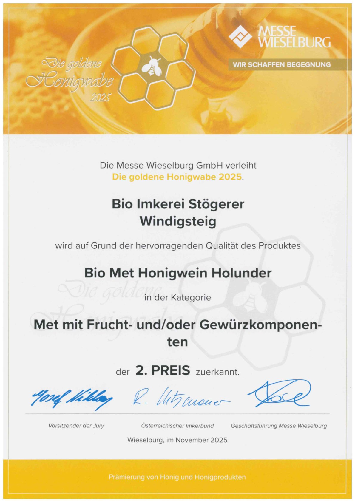 Diese spezielle Auszeichnung erhalten Imkereibetriebe die den strengen Kriterien des Honig-Gütesiegel mit ihren Produkten entsprechen. Durch eine Betriebskontrolle des NÖ Imkerverbands vor Ort wird kontrolliert ob der Betrieb allen Anforderungen, Gebäudetechnisch vom Honiglager über den Schleuderraum und den Verarbeitungsräumen, sowie im Bereich der Lebensmittelhygiene und Bienenhaltung, in vorbildlicher Weise allen Bestimmungen entspricht.
